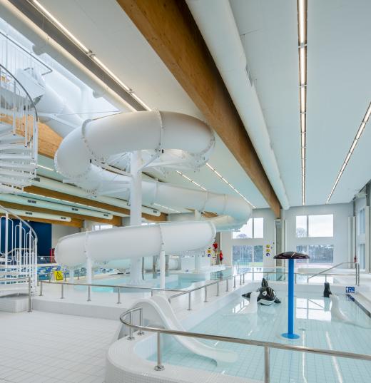Czujki punktowe z serii 6000PLUS, które zostały zamontowane na korytarzach i w salach lekcyjnych posiadają zaawansowany algorytm analizy czynnika pożarowego zabezpieczające przed fałszywymi alarmami. Dodatkowo czujki są wyposażone w sygnalizator akustyczny, któremu poza jego podstawową funkcją znaleziono specjalne zastosowanie – w trybie normalnej pracy pełni rolę dzwonka na lekcje. Zarówno basen, jak i hala sportowa wymagały dedykowanych rozwiązań – tradycyjne czujki montowane pod sufitem nie zdałyby tu egzaminu ze względu na utrudniony dostęp i serwisowanie, ryzyko uszkodzenia czy podwyższoną wilgotność. W pływalni zastosowano czujkę zasysającą ProPoint PLUS – rurki detekcyjne są poprowadzone w przestrzeni międzysufitowej, ale nie wymagają bezpośredniego dostępu podczas serwisowania. Dodatkowo są wyposażone w pułapkę przeciwwilgociową, która zapobiega dostaniu się wody do komór detekcyjnych czujki. Innym ciekawym rozwiązaniem są liniowe czujki 6000/FIREBEAM40 zastosowane w hali sportowej. Na ich wybór wpływ miała specyfika przestrzeni (duże ryzyko uszkodzeń mechanicznych przez piłki), wysokość stropu (utrudniony serwis tradycyjnych czujek punktowych). Czujka i lustro są ulokowane na przeciwległych końcach hali – wbudowany nadajnik i odbiornik na podczerwień pozwala wykryć dym na odcinku nawet 100 metrów.